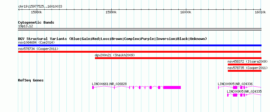 | Variant Type | CNV loss | Copy Number | | Allele State | | Allele Origin | | Probe Count | | Validation Flag | | Merged Status | M | Merged Variants | | Supporting Variants | nssv895584 | Samples | | Known Genes | LINC00661, LINC00905 | Method | SNP array | Analysis | Illumina SNP array copy number analysis | Platform | Not reported | Comments | | Reference | Cooper_et_al_2011 | Pubmed ID | 21841781 | Accession Number(s) | nsv578734