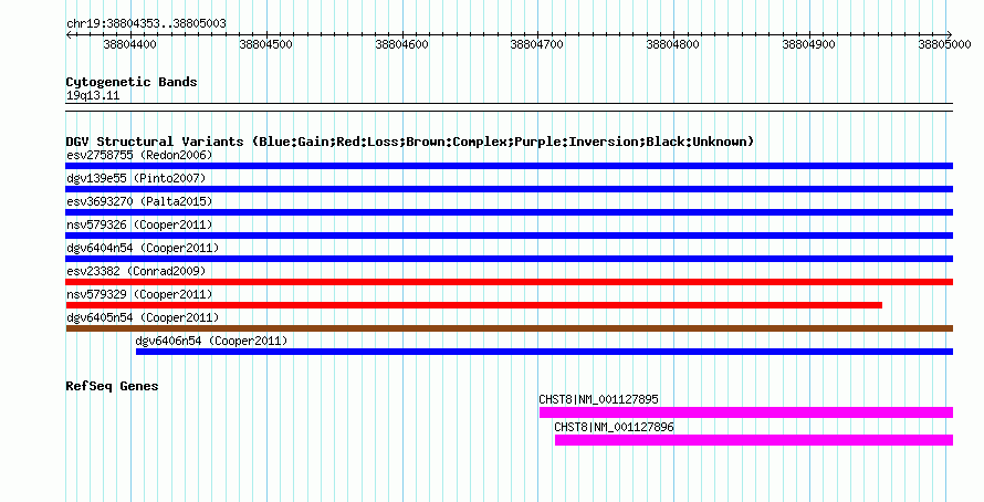 Variant DetailsVariant: nsv579330| Internal ID | 16366739 | | Landmark | | | Location Information | | | Cytoband | 19q13.11 | | Allele length | | Assembly | Allele length | | hg38 | 651 | | hg19 | 651 | | hg18 | 651 |