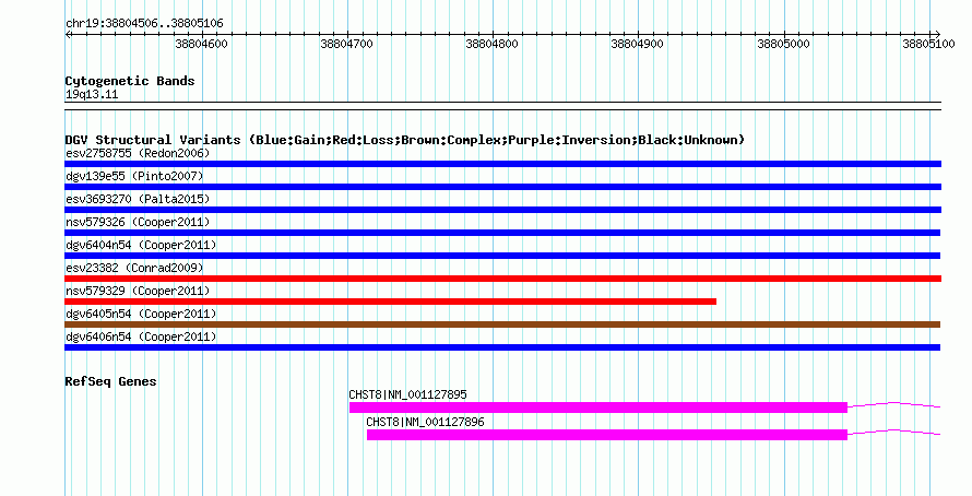 Variant DetailsVariant: nsv579338| Internal ID | 16366747 | | Landmark | | | Location Information | | | Cytoband | 19q13.11 | | Allele length | | Assembly | Allele length | | hg38 | 601 | | hg19 | 601 | | hg18 | 601 |