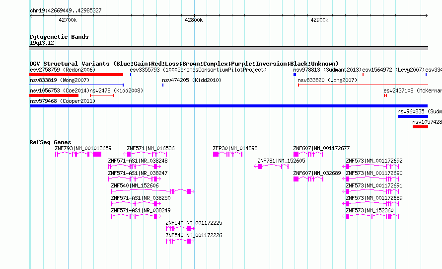 Variant DetailsVariant: nsv579468| Internal ID | 16366877 | | Landmark | | | Location Information | | | Cytoband | 19q13.12 | | Allele length | | Assembly | Allele length | | hg38 | 316141 | | hg19 | 315879 | | hg18 | 315879 |