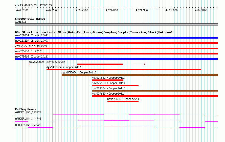 Variant DetailsVariant: nsv579616| Internal ID | 16367025 | | Landmark | | | Location Information | | | Cytoband | 19q13.2 | | Allele length | | Assembly | Allele length | | hg38 | 603 | | hg19 | 679 | | hg18 | 679 |
