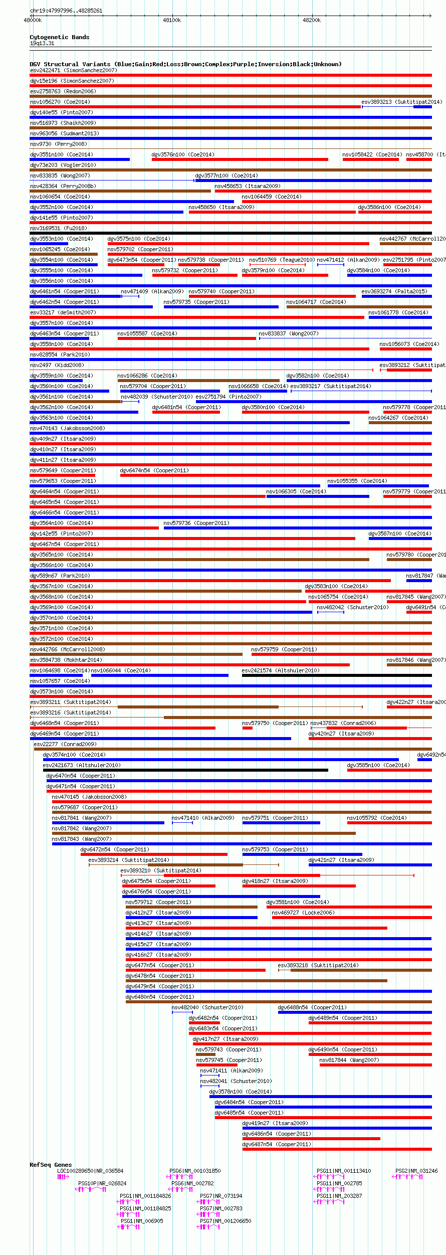 Variant DetailsVariant: nsv579666| Internal ID | 16367075 | | Landmark | | | Location Information | | | Cytoband | 19q13.2 | | Allele length | | Assembly | Allele length | | hg38 | 287266 | | hg19 | 287266 | | hg18 | 287266 |