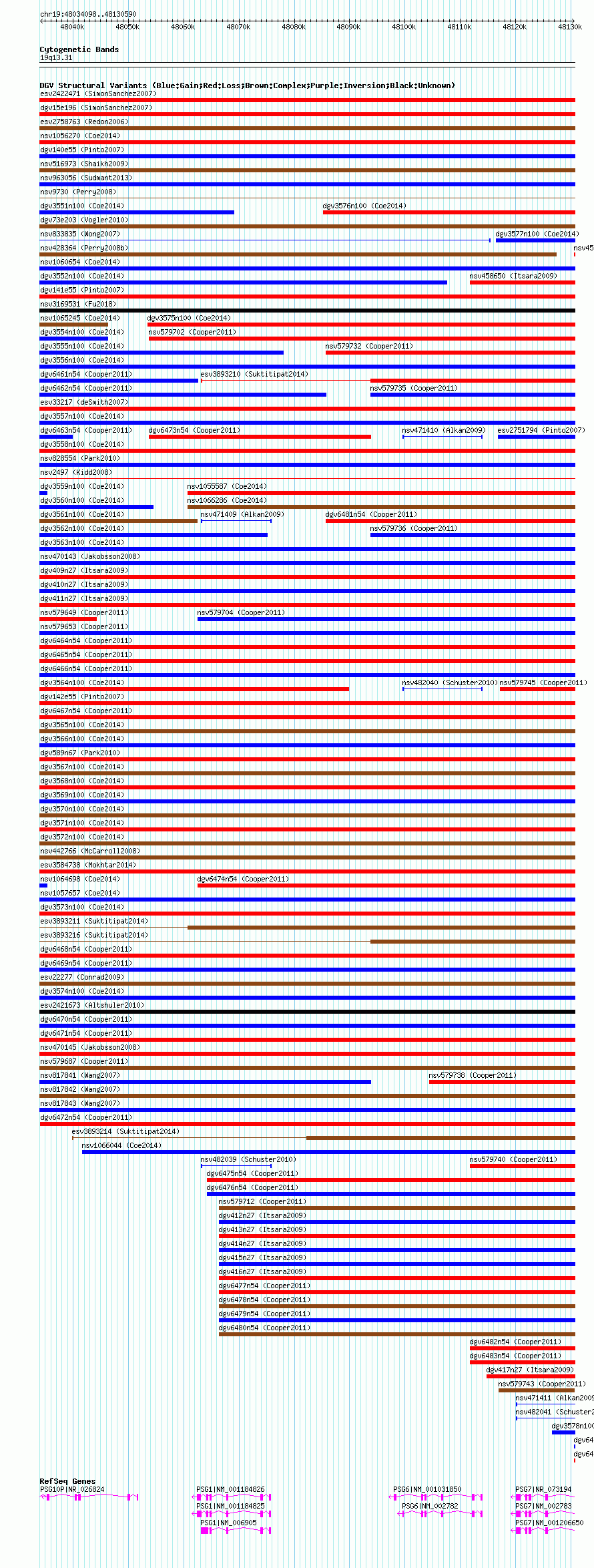 Variant DetailsVariant: nsv579695| Internal ID | 16367104 | | Landmark | | | Location Information | | | Cytoband | 19q13.2 | | Allele length | | Assembly | Allele length | | hg38 | 96493 | | hg19 | 96493 | | hg18 | 96493 |
