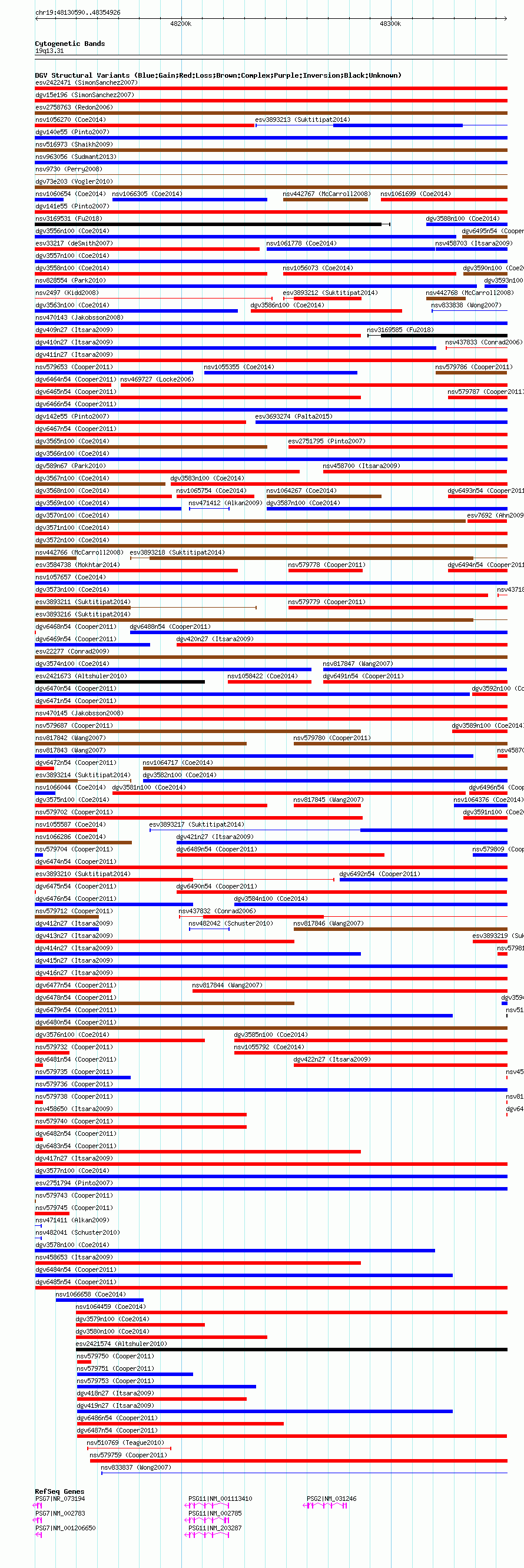 Variant DetailsVariant: nsv579748| Internal ID | 16367157 | | Landmark | | | Location Information | | | Cytoband | 19q13.31 | | Allele length | | Assembly | Allele length | | hg38 | 224337 | | hg19 | 224337 | | hg18 | 224337 |