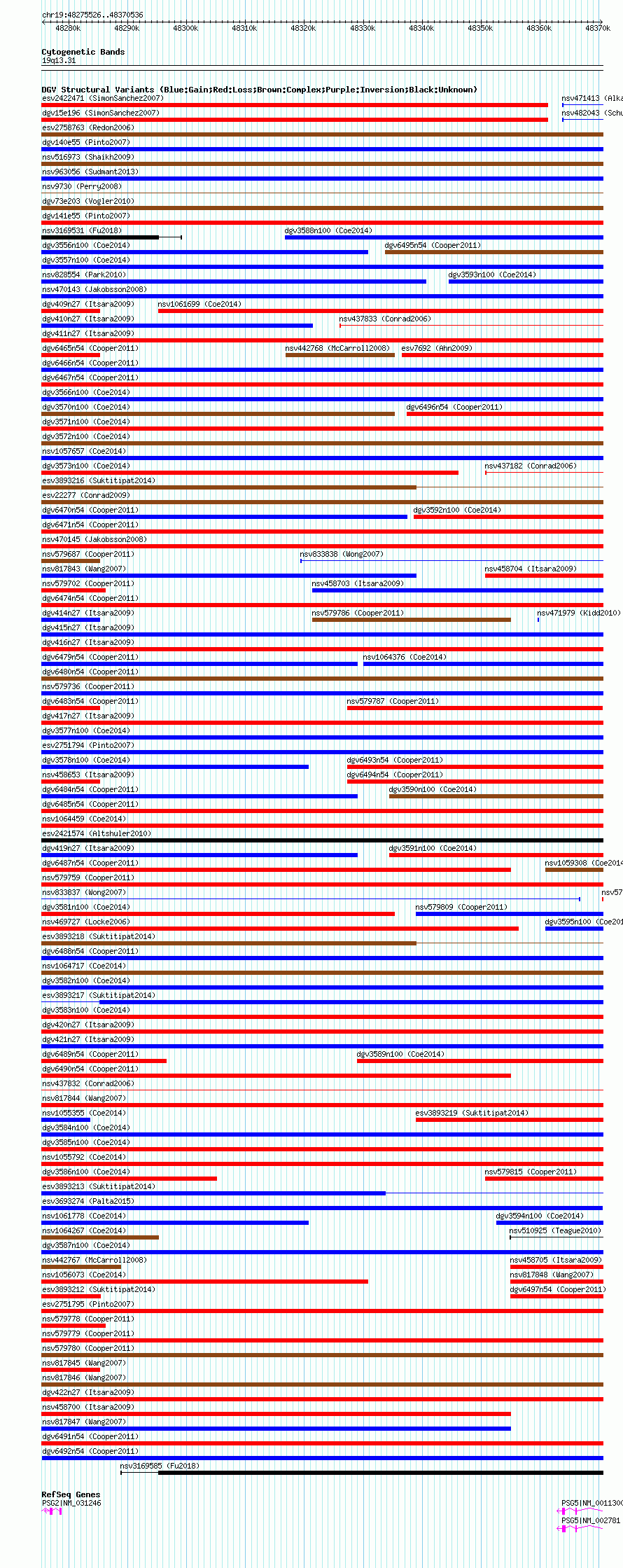 Variant DetailsVariant: nsv579783| Internal ID | 16367192 | | Landmark | | | Location Information | | | Cytoband | 19q13.31 | | Allele length | | Assembly | Allele length | | hg38 | 95011 | | hg19 | 95011 | | hg18 | 95011 |