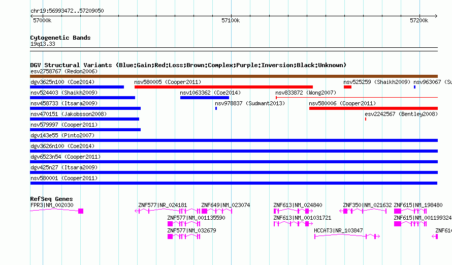 | | Variant Type | CNV gain | | Copy Number | | | Allele State | | | Allele Origin | | | Probe Count | | | Validation Flag | | | Merged Status | M | | Merged Variants | | | Supporting Variants | nssv900960 | | Samples | | | Known Genes | FPR3, HCCAT3, ZNF350, ZNF577, ZNF613, ZNF614, ZNF615, ZNF649 | | Method | SNP array | | Analysis | Illumina SNP array copy number analysis | | Platform | Not reported | | Comments | | | Reference | Cooper_et_al_2011 | | Pubmed ID | 21841781 | | Accession Number(s) | nsv580001