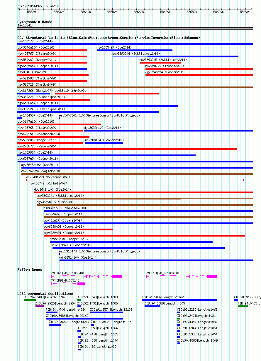 Variant DetailsVariant: nsv580087Internal ID | 16020810 | Landmark | | Location Information | | Cytoband | 19q13.41 | Allele length | Assembly | Allele length | hg38 | 88244 | hg19 | 88245 | hg18 | 88245 |