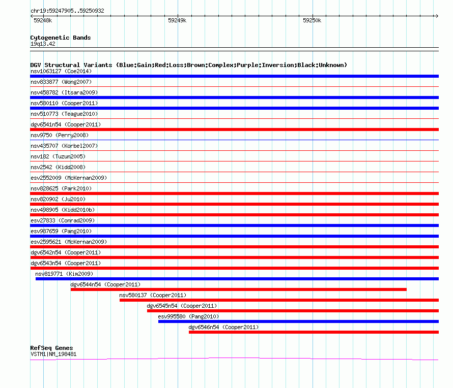 | Variant Type | CNV loss | Copy Number | | Allele State | | Allele Origin | | Probe Count | | Validation Flag | | Merged Status | M | Merged Variants | dgv6542n54 | Supporting Variants | nssv901196, nssv901197 | Samples | | Known Genes | VSTM1 | Method | SNP array | Analysis | Illumina SNP array copy number analysis | Platform | Not reported | Comments | | Reference | Cooper_et_al_2011 | Pubmed ID | 21841781 | Accession Number(s) | nsv580118