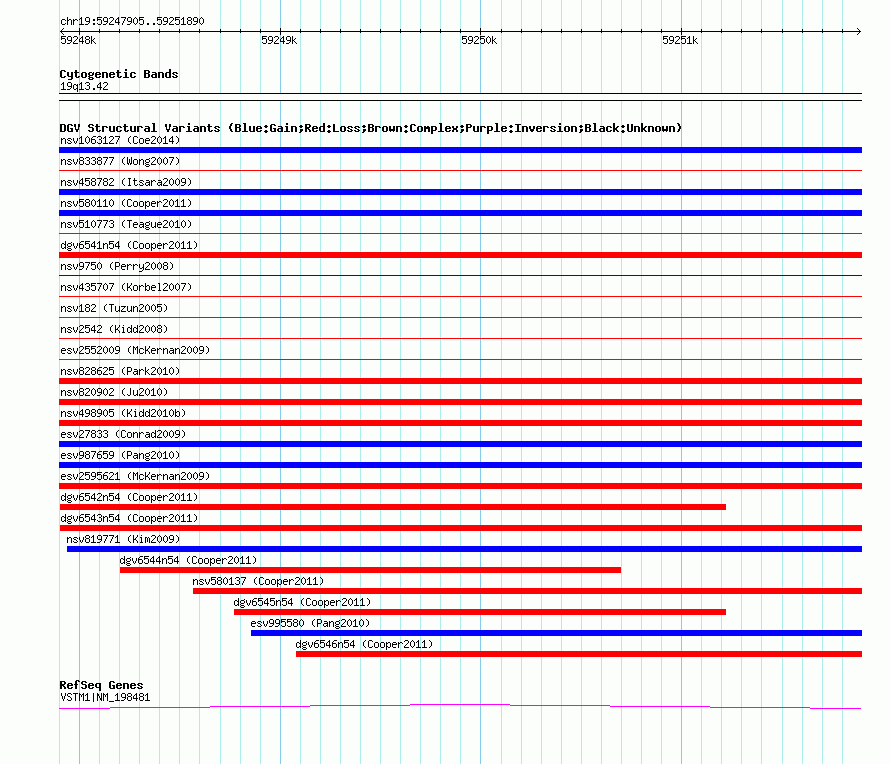 Variant DetailsVariant: nsv580120| Internal ID | 16367529 | | Landmark | | | Location Information | | | Cytoband | 19q13.42 | | Allele length | | Assembly | Allele length | | hg38 | 3986 | | hg19 | 3986 | | hg18 | 3986 |