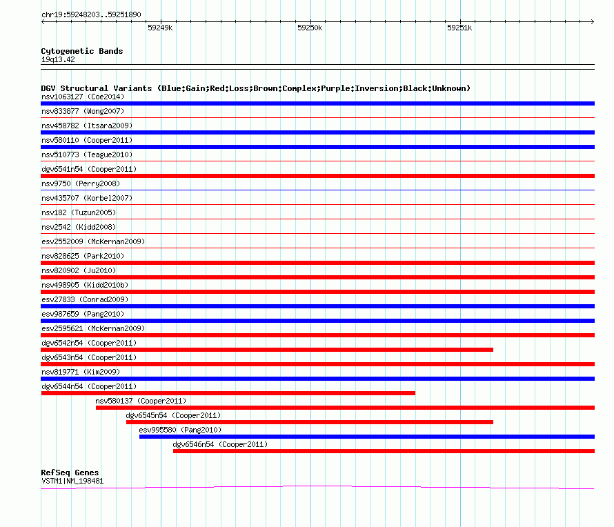 Variant DetailsVariant: nsv580125| Internal ID | 16367534 | | Landmark | | | Location Information | | | Cytoband | 19q13.42 | | Allele length | | Assembly | Allele length | | hg38 | 3688 | | hg19 | 3688 | | hg18 | 3688 |