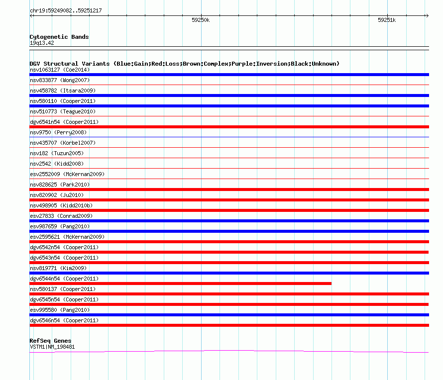 | Variant Type | CNV loss | Copy Number | | Allele State | | Allele Origin | | Probe Count | | Validation Flag | | Merged Status | M | Merged Variants | dgv6545n54 | Supporting Variants | nssv901365, nssv901364 | Samples | | Known Genes | VSTM1 | Method | SNP array | Analysis | Illumina SNP array copy number analysis | Platform | Not reported | Comments | | Reference | Cooper_et_al_2011 | Pubmed ID | 21841781 | Accession Number(s) | nsv580141