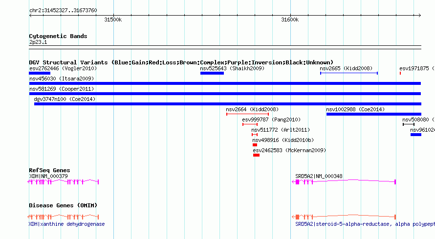 | | Variant Type | CNV gain | | Copy Number | | | Allele State | | | Allele Origin | | | Probe Count | | | Validation Flag | | | Merged Status | M | | Merged Variants | | | Supporting Variants | nssv1150199, nssv904626 | | Samples | 1780854095_A | | Known Genes | SRD5A2, XDH | | Method | SNP array | | Analysis | Illumina SNP array copy number analysis | | Platform | Not reported | | Comments | | | Reference | Cooper_et_al_2011 | | Pubmed ID | 21841781 | | Accession Number(s) | nsv581269