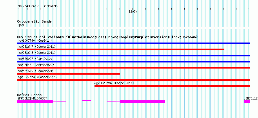 Variant DetailsVariant: nsv581651| Internal ID | 16022374 | | Landmark | | | Location Information | | | Cytoband | 2p21 | | Allele length | | Assembly | Allele length | | hg38 | 1775 | | hg19 | 1775 | | hg18 | 1775 |