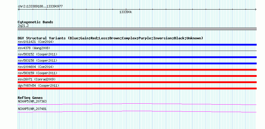 | | Variant Type | CNV loss | | Copy Number | | | Allele State | | | Allele Origin | | | Probe Count | | | Validation Flag | | | Merged Status | M | | Merged Variants | dgv7087n54 | | Supporting Variants | nssv920085, nssv920080, nssv920082, nssv920084, nssv920081, nssv920083, nssv920087, nssv920086 | | Samples | | | Known Genes | MIR7853, NCKAP5 | | Method | SNP array | | Analysis | Illumina SNP array copy number analysis | | Platform | Not reported | | Comments | | | Reference | Cooper_et_al_2011 | | Pubmed ID | 21841781 | | Accession Number(s) | nsv583162