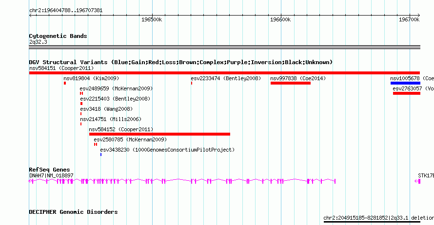 Variant DetailsVariant: nsv584151| Internal ID | 16371560 | | Landmark | | | Location Information | | | Cytoband | 2q32.3 | | Allele length | | Assembly | Allele length | | hg38 | 302594 | | hg19 | 302594 | | hg18 | 302594 |