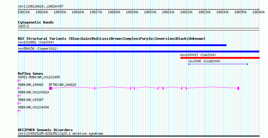 Variant DetailsVariant: nsv584156| Internal ID | 16371565 | | Landmark | | | Location Information | | | Cytoband | 2q33.1 | | Allele length | | Assembly | Allele length | | hg38 | 133440 | | hg19 | 133440 | | hg18 | 133440 |