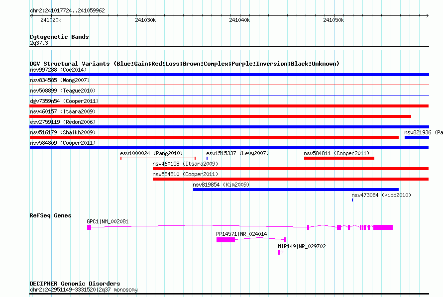 Variant DetailsVariant: nsv584809| Internal ID | 16372218 | | Landmark | | | Location Information | | | Cytoband | 2q37.3 | | Allele length | | Assembly | Allele length | | hg38 | 42239 | | hg19 | 42239 | | hg18 | 42239 |