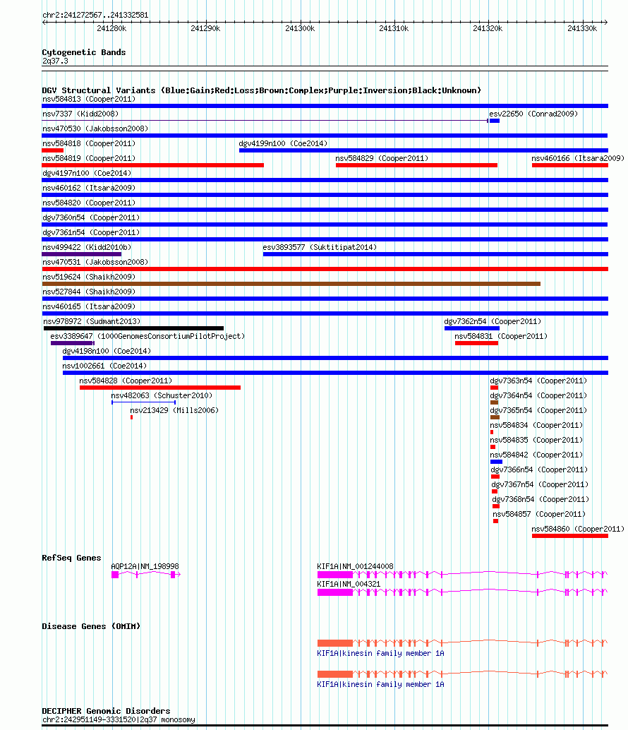 | | Variant Type | CNV gain | | Copy Number | | | Allele State | | | Allele Origin | | | Probe Count | | | Validation Flag | | | Merged Status | M | | Merged Variants | dgv7360n54 | | Supporting Variants | nssv933837 | | Samples | | | Known Genes | AQP12A, KIF1A | | Method | SNP array | | Analysis | Illumina SNP array copy number analysis | | Platform | Not reported | | Comments | | | Reference | Cooper_et_al_2011 | | Pubmed ID | 21841781 | | Accession Number(s) | nsv584824