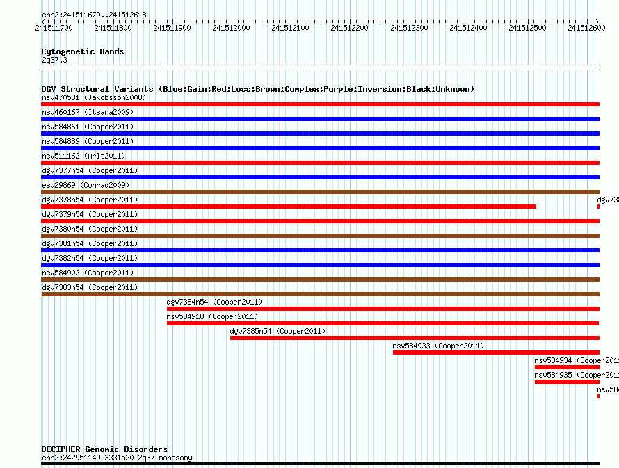 Variant DetailsVariant: nsv584905| Internal ID | 16372314 | | Landmark | | | Location Information | | | Cytoband | 2q37.3 | | Allele length | | Assembly | Allele length | | hg38 | 940 | | hg19 | 940 | | hg18 | 940 |
