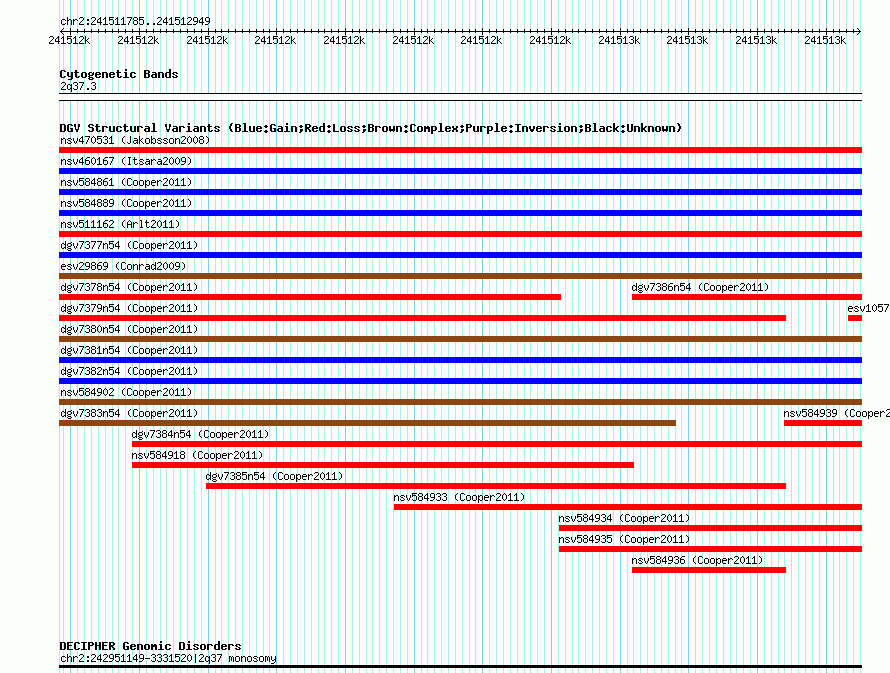 Variant DetailsVariant: nsv584914| Internal ID | 16372323 | | Landmark | | | Location Information | | | Cytoband | 2q37.3 | | Allele length | | Assembly | Allele length | | hg38 | 1165 | | hg19 | 1165 | | hg18 | 1165 |