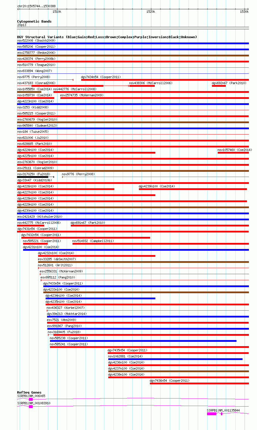 Variant DetailsVariant: nsv585217| Internal ID | 16372626 | | Landmark | | | Location Information | | | Cytoband | 20p13 | | Allele length | | Assembly | Allele length | | hg38 | 24645 | | hg19 | 24645 | | hg18 | 24645 |