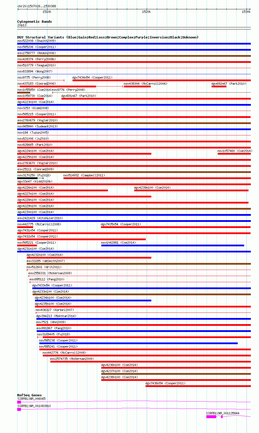 Variant DetailsVariant: nsv585228| Internal ID | 16372637 | | Landmark | | | Location Information | | | Cytoband | 20p13 | | Allele length | | Assembly | Allele length | | hg38 | 23363 | | hg19 | 23363 | | hg18 | 23363 |