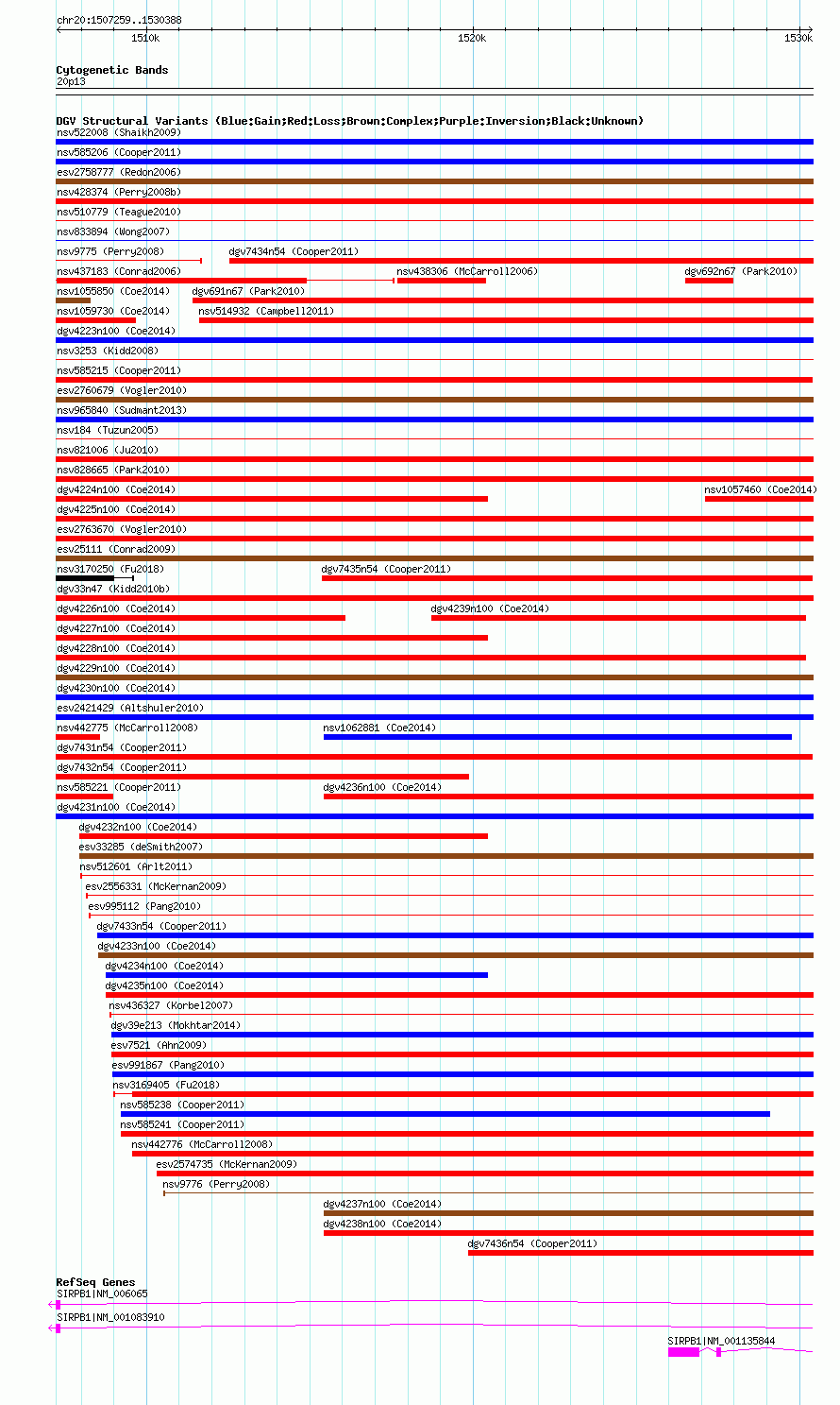 Variant DetailsVariant: nsv585229| Internal ID | 16372638 | | Landmark | | | Location Information | | | Cytoband | 20p13 | | Allele length | | Assembly | Allele length | | hg38 | 23130 | | hg19 | 23130 | | hg18 | 23130 |
