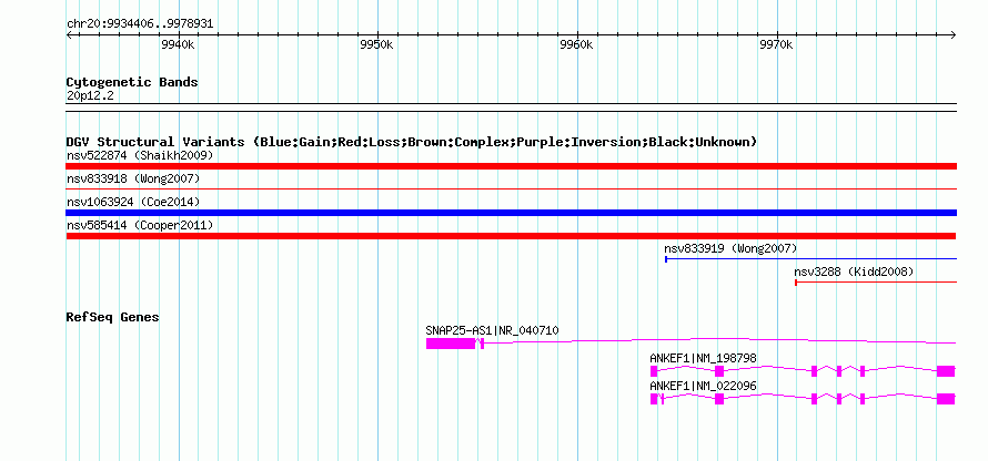 Variant DetailsVariant: nsv585414| Internal ID | 16372823 | | Landmark | | | Location Information | | | Cytoband | 20p12.2 | | Allele length | | Assembly | Allele length | | hg38 | 44526 | | hg19 | 44526 | | hg18 | 44526 |