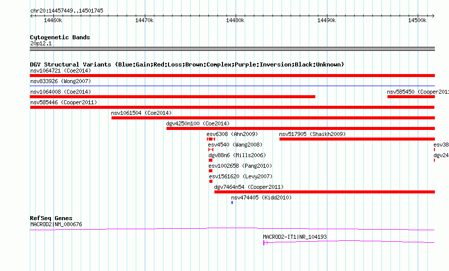 Variant DetailsVariant: nsv585446| Internal ID | 16372855 | | Landmark | | | Location Information | | | Cytoband | 20p12.1 | | Allele length | | Assembly | Allele length | | hg38 | 44297 | | hg19 | 44297 | | hg18 | 44297 |