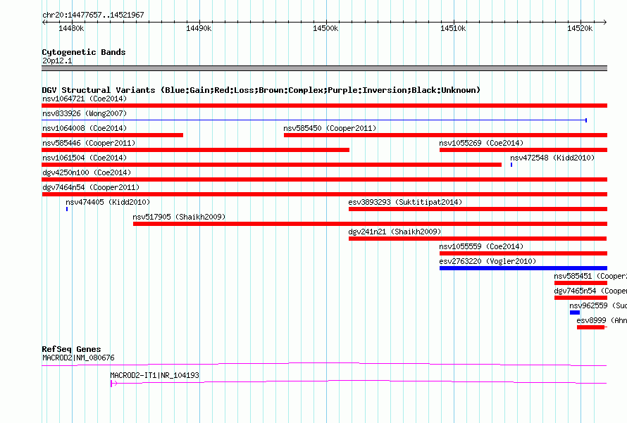 | Variant Type | CNV loss | Copy Number | | Allele State | | Allele Origin | | Probe Count | | Validation Flag | | Merged Status | M | Merged Variants | dgv7464n54 | Supporting Variants | nssv938046 | Samples | | Known Genes | MACROD2, MACROD2-IT1 | Method | SNP array | Analysis | Illumina SNP array copy number analysis | Platform | Not reported | Comments | | Reference | Cooper_et_al_2011 | Pubmed ID | 21841781 | Accession Number(s) | nsv585447