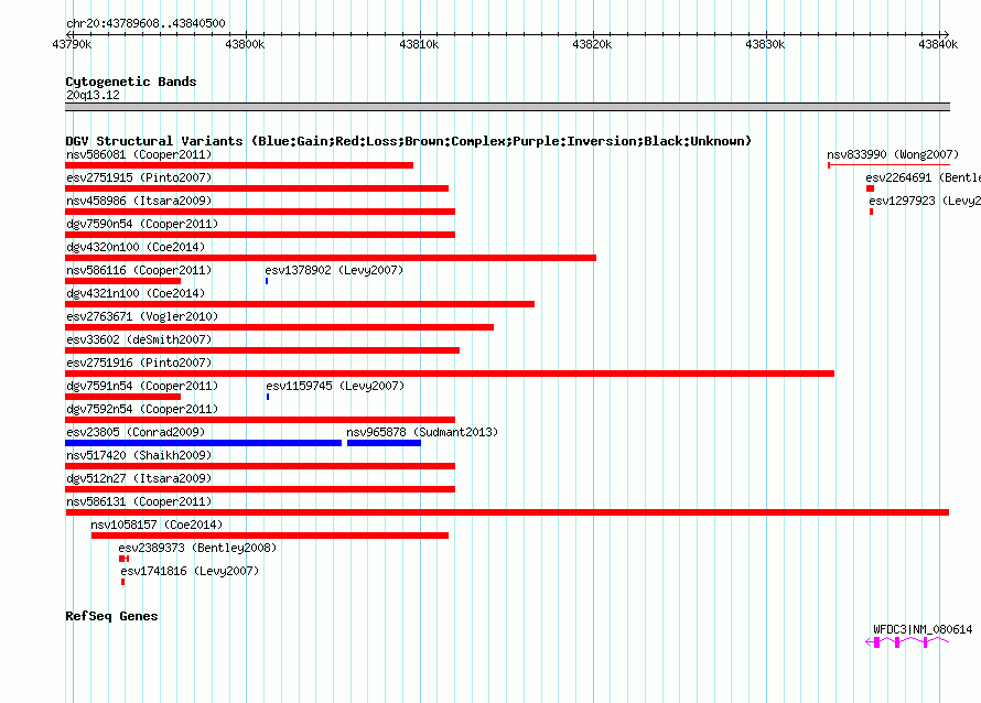| Variant Type | CNV loss | Copy Number | | Allele State | | Allele Origin | | Probe Count | | Validation Flag | | Merged Status | M | Merged Variants | | Supporting Variants | nssv940868, nssv940869 | Samples | | Known Genes | WFDC3 | Method | SNP array | Analysis | Illumina SNP array copy number analysis | Platform | Not reported | Comments | | Reference | Cooper_et_al_2011 | Pubmed ID | 21841781 | Accession Number(s) | nsv586131