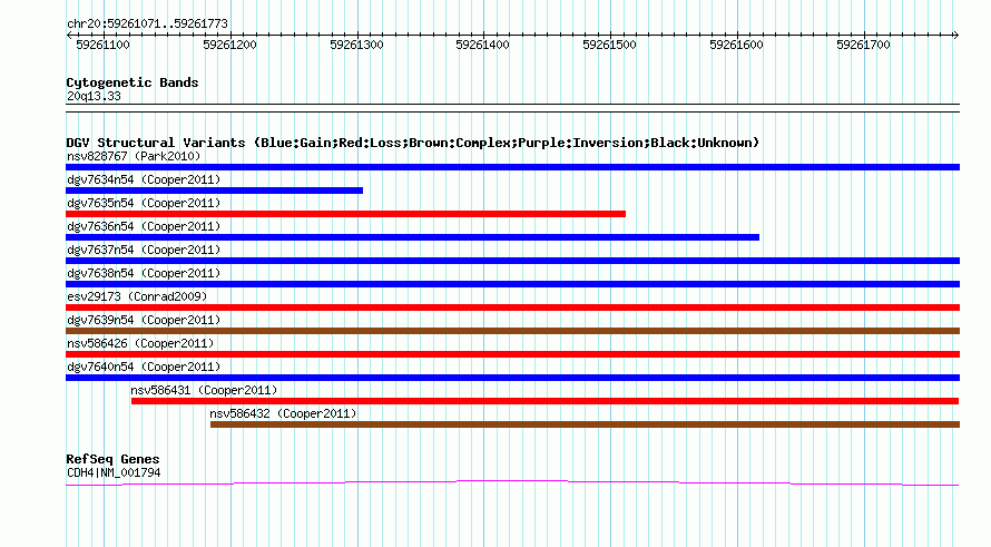| | Variant Type | CNV gain | | Copy Number | | | Allele State | | | Allele Origin | | | Probe Count | | | Validation Flag | | | Merged Status | M | | Merged Variants | dgv7640n54 | | Supporting Variants | nssv941957, nssv941958 | | Samples | | | Known Genes | CDH4 | | Method | SNP array | | Analysis | Illumina SNP array copy number analysis | | Platform | Not reported | | Comments | | | Reference | Cooper_et_al_2011 | | Pubmed ID | 21841781 | | Accession Number(s) | nsv586429