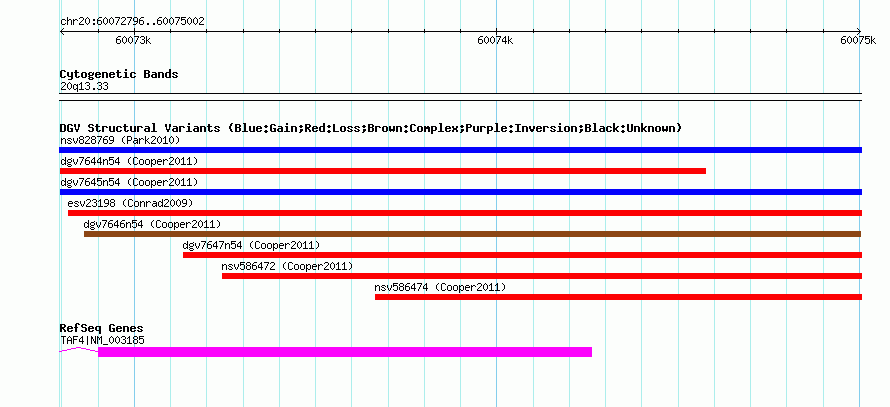 | | Variant Type | CNV gain | | Copy Number | | | Allele State | | | Allele Origin | | | Probe Count | | | Validation Flag | | | Merged Status | M | | Merged Variants | dgv7645n54 | | Supporting Variants | nssv941985, nssv941984 | | Samples | | | Known Genes | TAF4 | | Method | SNP array | | Analysis | Illumina SNP array copy number analysis | | Platform | Not reported | | Comments | | | Reference | Cooper_et_al_2011 | | Pubmed ID | 21841781 | | Accession Number(s) | nsv586454