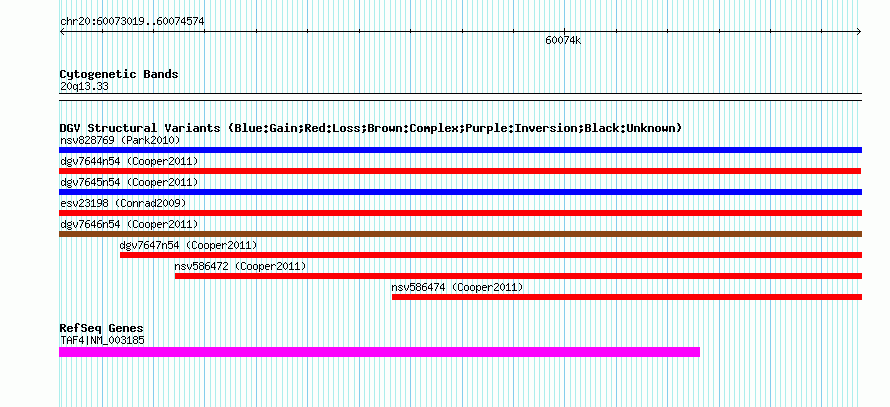 | | Variant Type | CNV gain+loss | | Copy Number | | | Allele State | | | Allele Origin | | | Probe Count | | | Validation Flag | | | Merged Status | M | | Merged Variants | dgv7646n54 | | Supporting Variants | nssv942004, nssv942003 | | Samples | | | Known Genes | TAF4 | | Method | SNP array | | Analysis | Illumina SNP array copy number analysis | | Platform | Not reported | | Comments | | | Reference | Cooper_et_al_2011 | | Pubmed ID | 21841781 | | Accession Number(s) | nsv586460