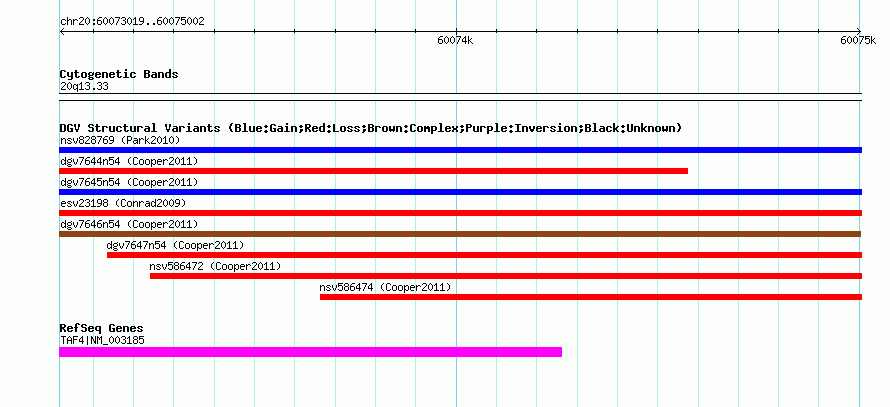 | | Variant Type | CNV gain+loss | | Copy Number | | | Allele State | | | Allele Origin | | | Probe Count | | | Validation Flag | | | Merged Status | M | | Merged Variants | dgv7646n54 | | Supporting Variants | nssv942017, nssv942016, nssv942018, nssv942020, nssv942022, nssv942021, nssv942019 | | Samples | | | Known Genes | TAF4 | | Method | SNP array | | Analysis | Illumina SNP array copy number analysis | | Platform | Not reported | | Comments | | | Reference | Cooper_et_al_2011 | | Pubmed ID | 21841781 | | Accession Number(s) | nsv586463