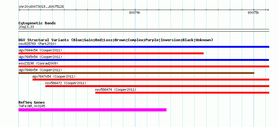 | | Variant Type | CNV gain | | Copy Number | | | Allele State | | | Allele Origin | | | Probe Count | | | Validation Flag | | | Merged Status | M | | Merged Variants | dgv7645n54 | | Supporting Variants | nssv942023, nssv942024 | | Samples | | | Known Genes | TAF4 | | Method | SNP array | | Analysis | Illumina SNP array copy number analysis | | Platform | Not reported | | Comments | | | Reference | Cooper_et_al_2011 | | Pubmed ID | 21841781 | | Accession Number(s) | nsv586464