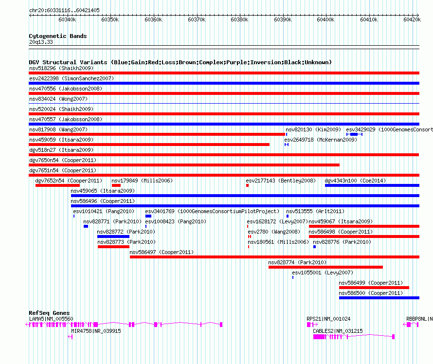 Variant DetailsVariant: nsv586489| Internal ID | 16373898 | | Landmark | | | Location Information | | | Cytoband | 20q13.33 | | Allele length | | Assembly | Allele length | | hg38 | 90290 | | hg19 | 90290 | | hg18 | 90290 |