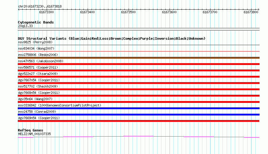 Variant DetailsVariant: nsv586580| Internal ID | 16373989 | | Landmark | | | Location Information | | | Cytoband | 20q13.33 | | Allele length | | Assembly | Allele length | | hg38 | 589 | | hg19 | 589 | | hg18 | 589 |