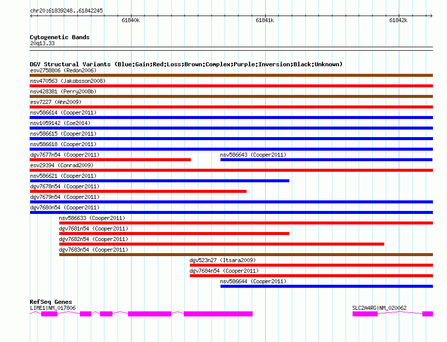 | | Variant Type | CNV gain | | Copy Number | | | Allele State | | | Allele Origin | | | Probe Count | | | Validation Flag | | | Merged Status | M | | Merged Variants | dgv7679n54 | | Supporting Variants | nssv943852, nssv943851, nssv943853 | | Samples | | | Known Genes | LIME1, SLC2A4RG | | Method | SNP array | | Analysis | Illumina SNP array copy number analysis | | Platform | Not reported | | Comments | | | Reference | Cooper_et_al_2011 | | Pubmed ID | 21841781 | | Accession Number(s) | nsv586623