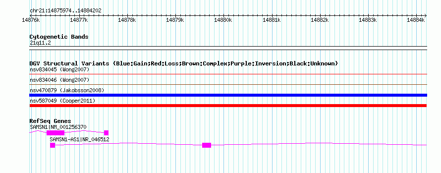 | Variant Type | CNV loss | Copy Number | | Allele State | | Allele Origin | | Probe Count | | Validation Flag | | Merged Status | M | Merged Variants | | Supporting Variants | nssv944953 | Samples | | Known Genes | SAMSN1, SAMSN1-AS1 | Method | SNP array | Analysis | Illumina SNP array copy number analysis | Platform | Not reported | Comments | | Reference | Cooper_et_al_2011 | Pubmed ID | 21841781 | Accession Number(s) | nsv587049