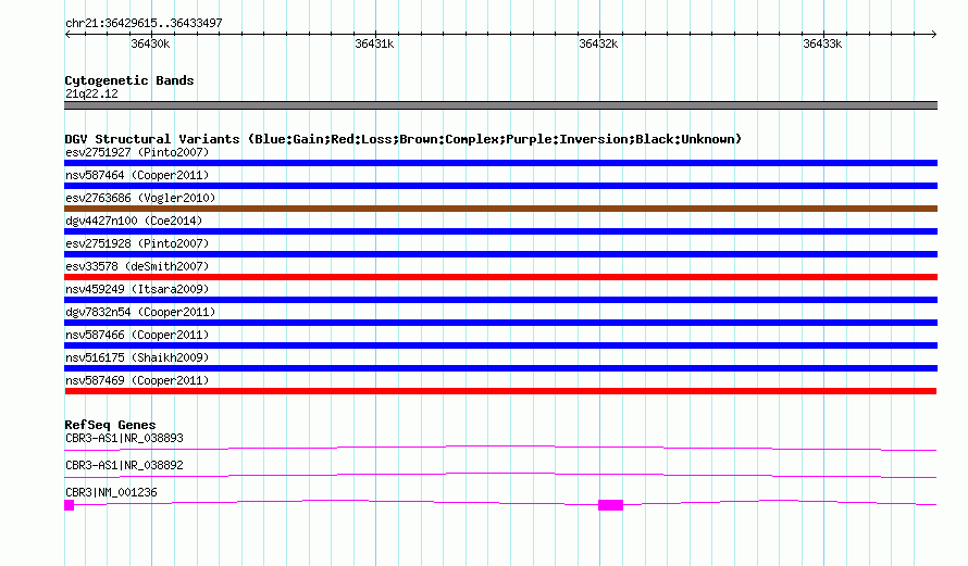 Variant DetailsVariant: nsv587469| Internal ID | 16374878 | | Landmark | | | Location Information | | | Cytoband | 21q22.12 | | Allele length | | Assembly | Allele length | | hg38 | 3883 | | hg19 | 3883 | | hg18 | 3883 |