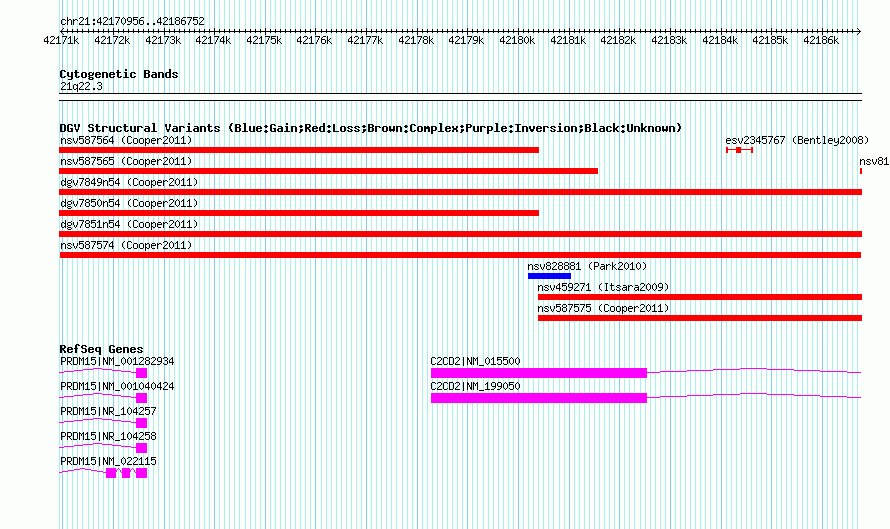 Variant DetailsVariant: nsv587574| Internal ID | 16028297 | | Landmark | | | Location Information | | | Cytoband | 21q22.3 | | Allele length | | Assembly | Allele length | | hg38 | 15797 | | hg19 | 15797 | | hg18 | 15797 |