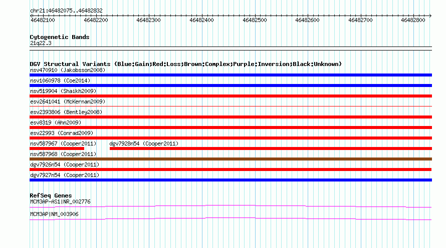 Variant DetailsVariant: nsv587971| Internal ID | 16375380 | | Landmark | | | Location Information | | | Cytoband | 21q22.3 | | Allele length | | Assembly | Allele length | | hg38 | 758 | | hg19 | 758 | | hg18 | 758 |