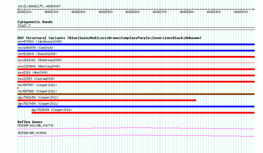 Variant DetailsVariant: nsv587972| Internal ID | 16375381 | | Landmark | | | Location Information | | | Cytoband | 21q22.3 | | Allele length | | Assembly | Allele length | | hg38 | 873 | | hg19 | 873 | | hg18 | 873 |