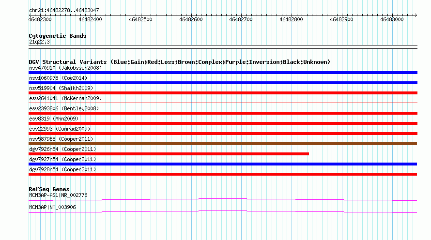 Variant DetailsVariant: nsv587974| Internal ID | 16375383 | | Landmark | | | Location Information | | | Cytoband | 21q22.3 | | Allele length | | Assembly | Allele length | | hg38 | 770 | | hg19 | 770 | | hg18 | 770 |