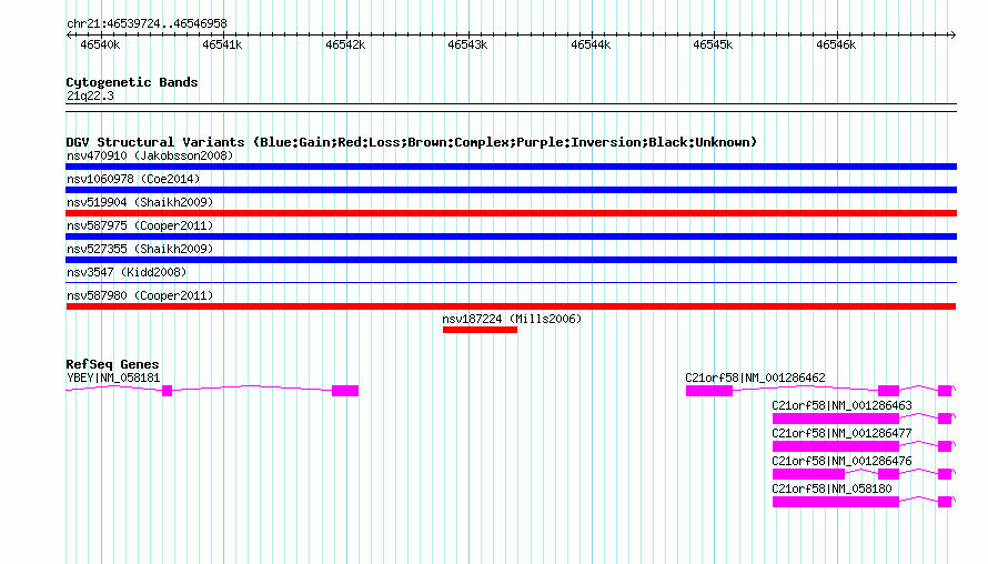 Variant DetailsVariant: nsv587980| Internal ID | 16028703 | | Landmark | | | Location Information | | | Cytoband | 21q22.3 | | Allele length | | Assembly | Allele length | | hg38 | 7235 | | hg19 | 7235 | | hg18 | 7235 |