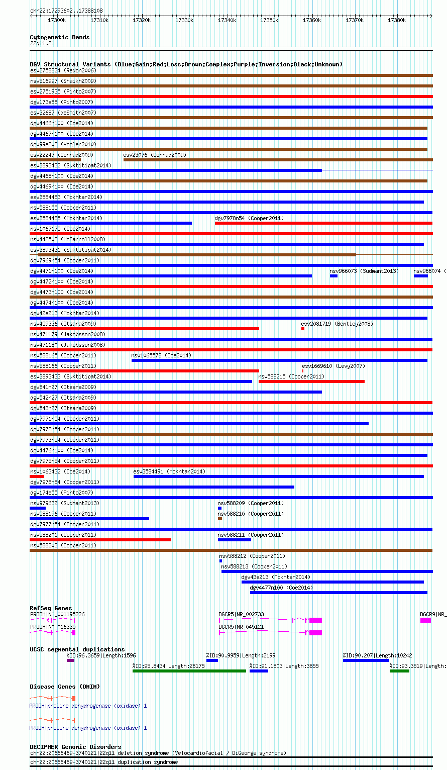 | Variant Type | CNV loss | Copy Number | | Allele State | | Allele Origin | | Probe Count | | Validation Flag | | Merged Status | M | Merged Variants | dgv7975n54 | Supporting Variants | nssv951687 | Samples | | Known Genes | DGCR5, DGCR9, PRODH | Method | SNP array | Analysis | Illumina SNP array copy number analysis | Platform | Not reported | Comments | | Reference | Cooper_et_al_2011 | Pubmed ID | 21841781 | Accession Number(s) | nsv588205