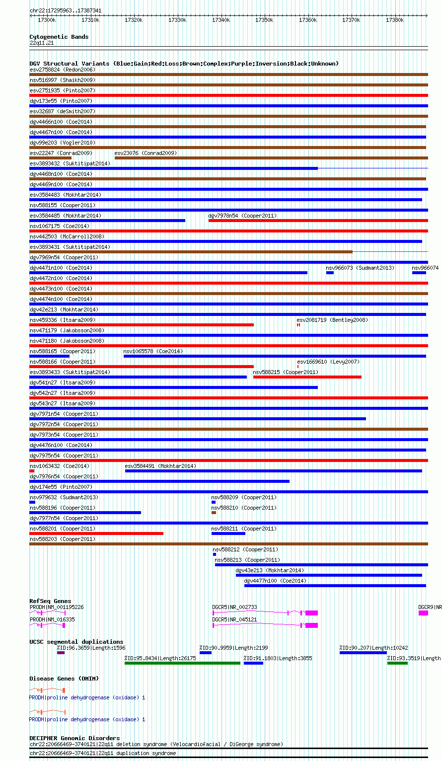 | Variant Type | CNV loss | Copy Number | | Allele State | | Allele Origin | | Probe Count | | Validation Flag | | Merged Status | M | Merged Variants | dgv7975n54 | Supporting Variants | nssv951688 | Samples | | Known Genes | DGCR5, DGCR9, PRODH | Method | SNP array | Analysis | Illumina SNP array copy number analysis | Platform | Not reported | Comments | | Reference | Cooper_et_al_2011 | Pubmed ID | 21841781 | Accession Number(s) | nsv588207