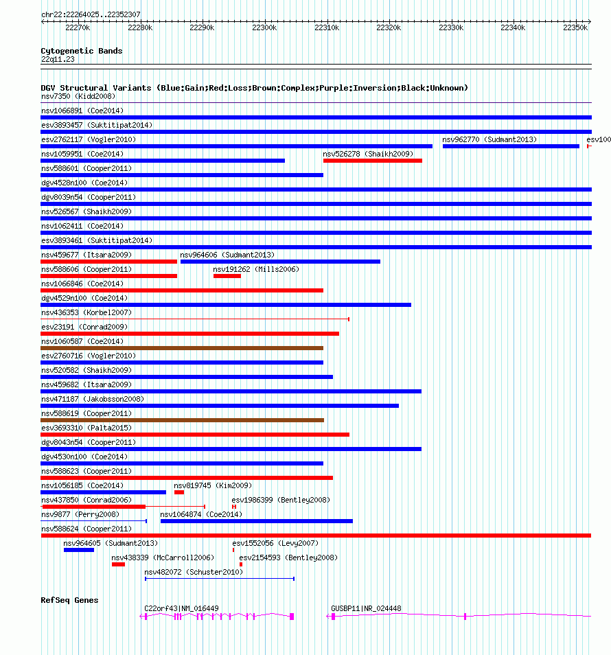 Variant DetailsVariant: nsv588624| Internal ID | 16376033 | | Landmark | | | Location Information | | | Cytoband | 22q11.23 | | Allele length | | Assembly | Allele length | | hg38 | 88283 | | hg19 | 88283 | | hg18 | 88283 |
