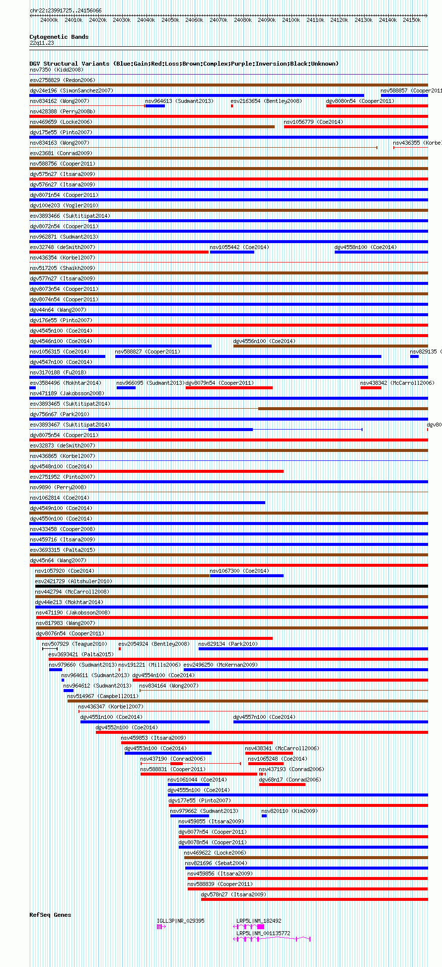 Variant DetailsVariant: nsv588775| Internal ID | 16376184 | | Landmark | | | Location Information | | | Cytoband | 22q11.23 | | Allele length | | Assembly | Allele length | | hg38 | 164342 | | hg19 | 164342 | | hg18 | 164342 |